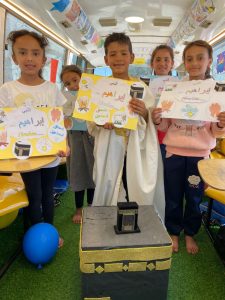 In an atmosphere of happiness and joy, and in celebration of the arrival of Eid al-Adha, students from a school in a bus welcomed the joy of the holiday by decorating the bus and chanting special Eid songs and chants they had been trained on beforehand. They were also introduced